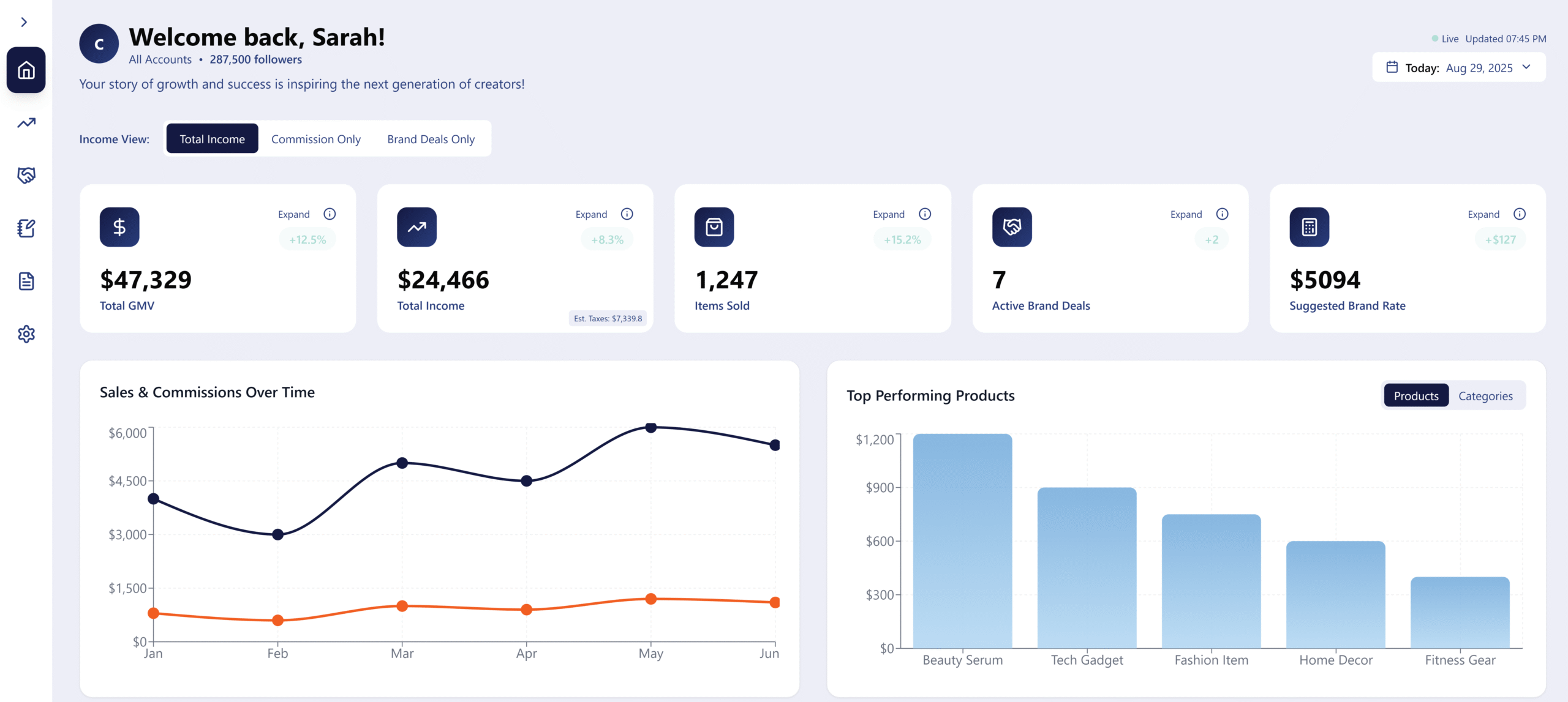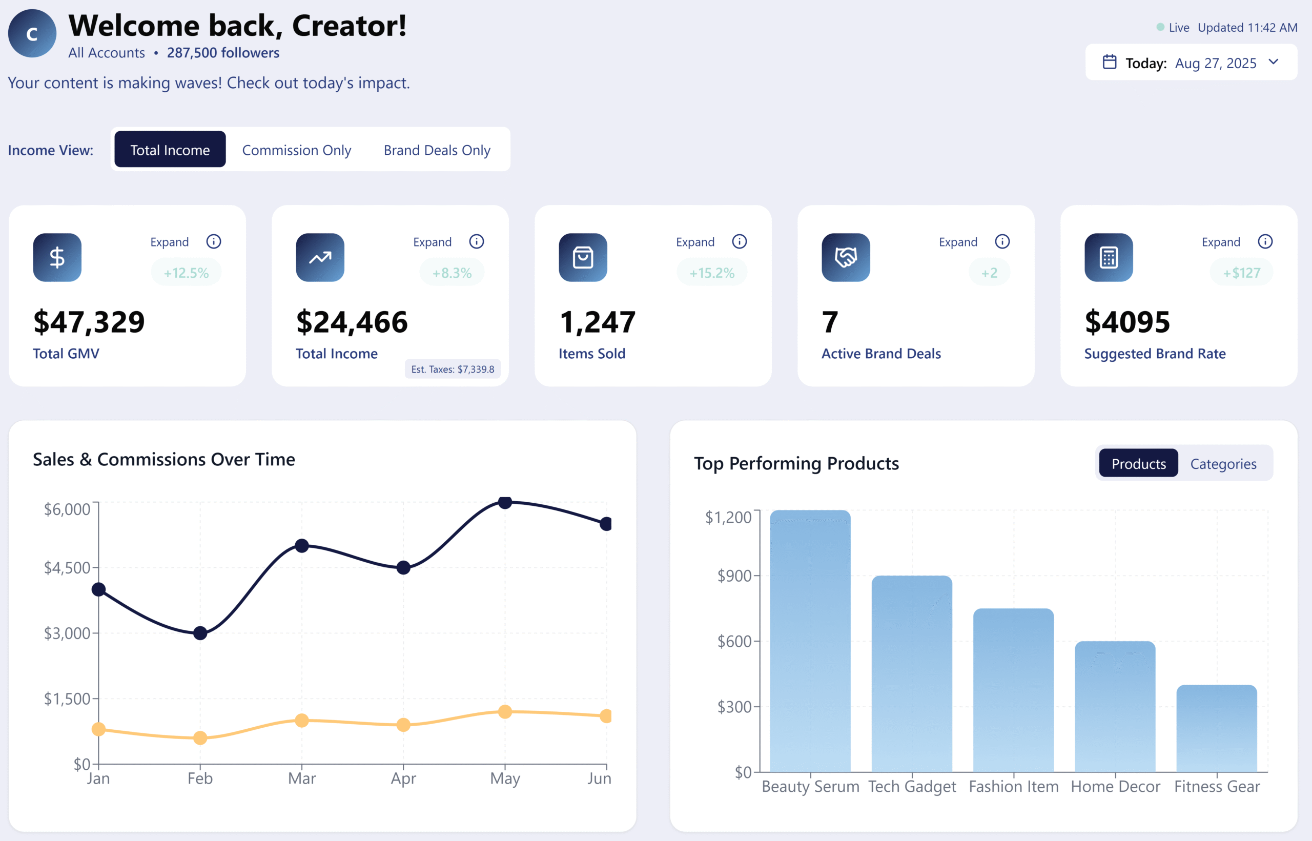 Our Flat Fee Calculator pulls your real TikTok Shop performance data; sales, GMV, and commissions then converts it into a data-backed rate you can confidently present to brands. Real numbers tied directly to your results.